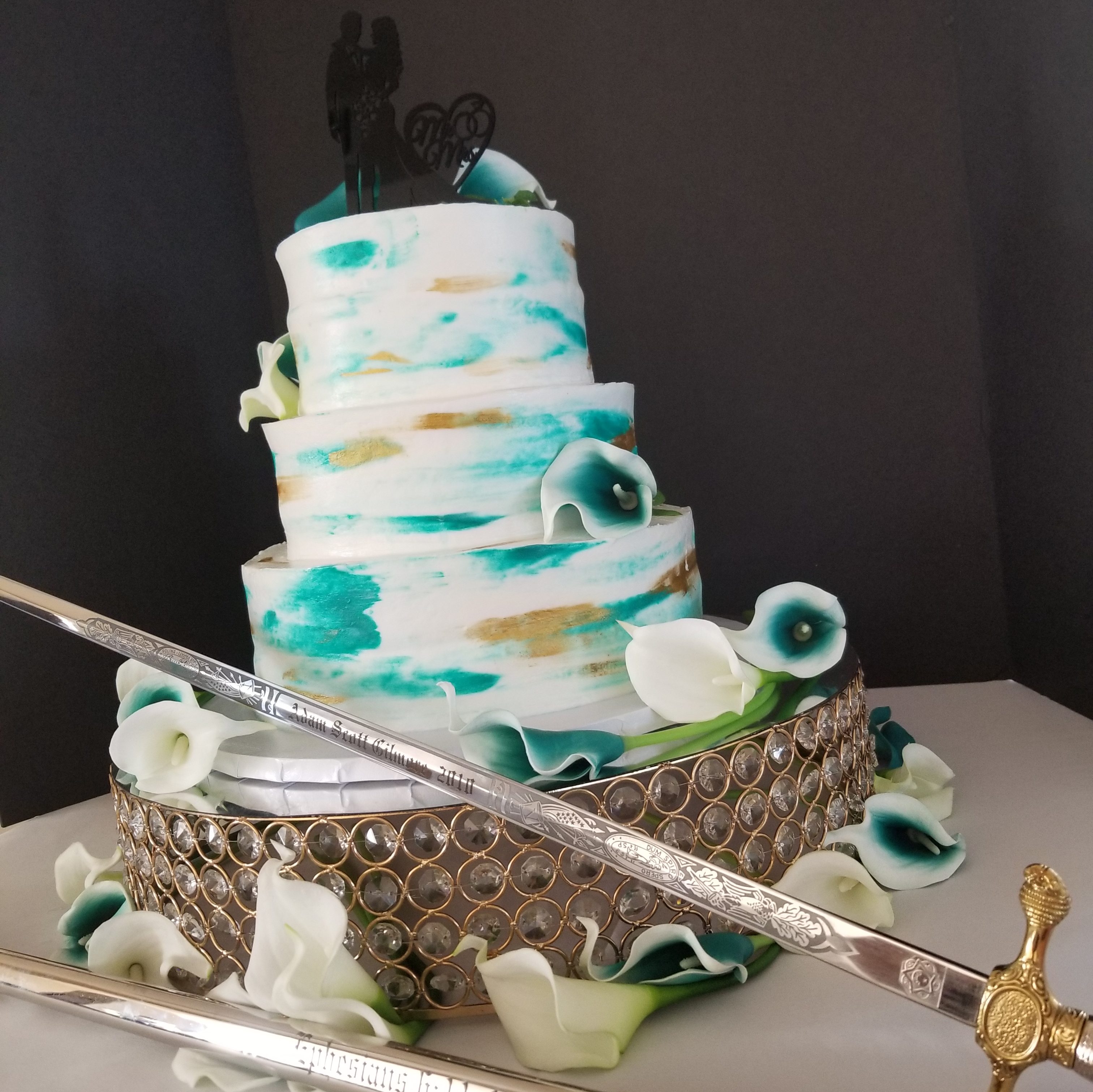 Our Marine cut his cake with his sword. Simple buttercream cake with smooth teal & gold brush strokes.