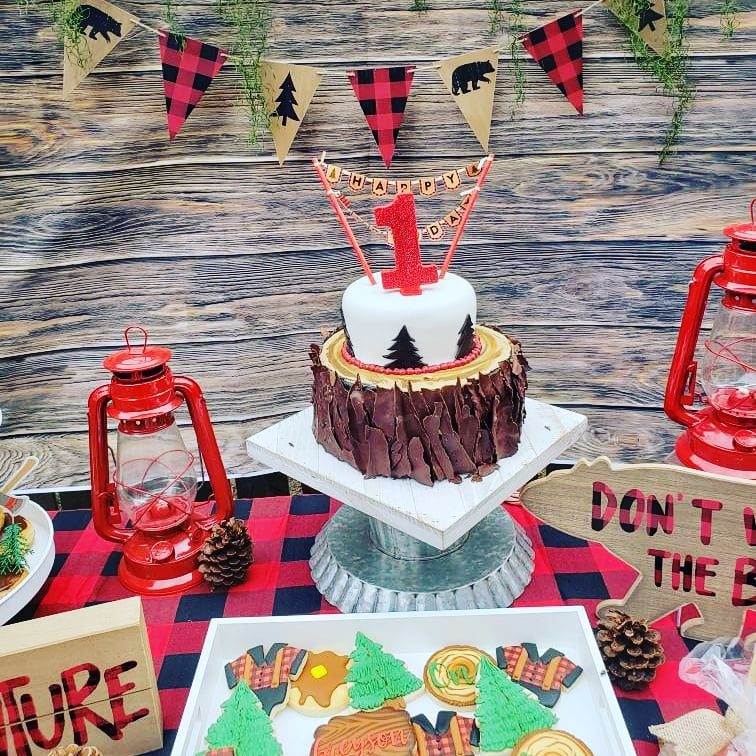 A cute small lumberjack birthday cake with the bottom tier as a tree trunk.
